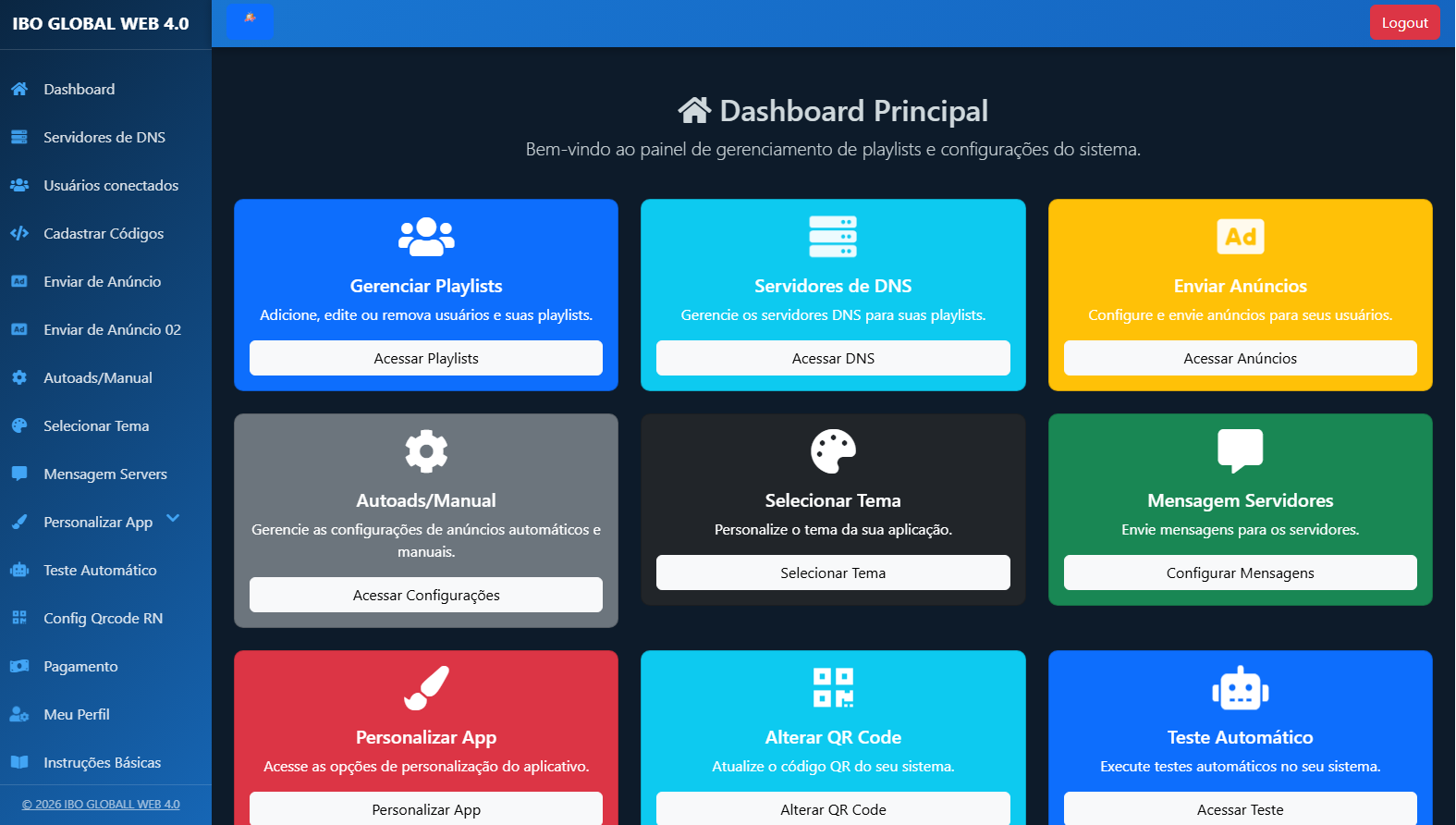O IBO GLOBALLWEB 4.0 é um aplicativo completo para gerenciamento de serviços STREAMING, projetado para proporcionar total controle e personalização, o aplicativo é rápido, fluido e de fácil acesso, oferecendo uma experiência prática e eficiente para assistir filmes, séries e canais. O painel de controle intuitivo permite que cada nível de usuário gerencie suas operações de forma personalizada, com uma ampla gama de funcionalidades.