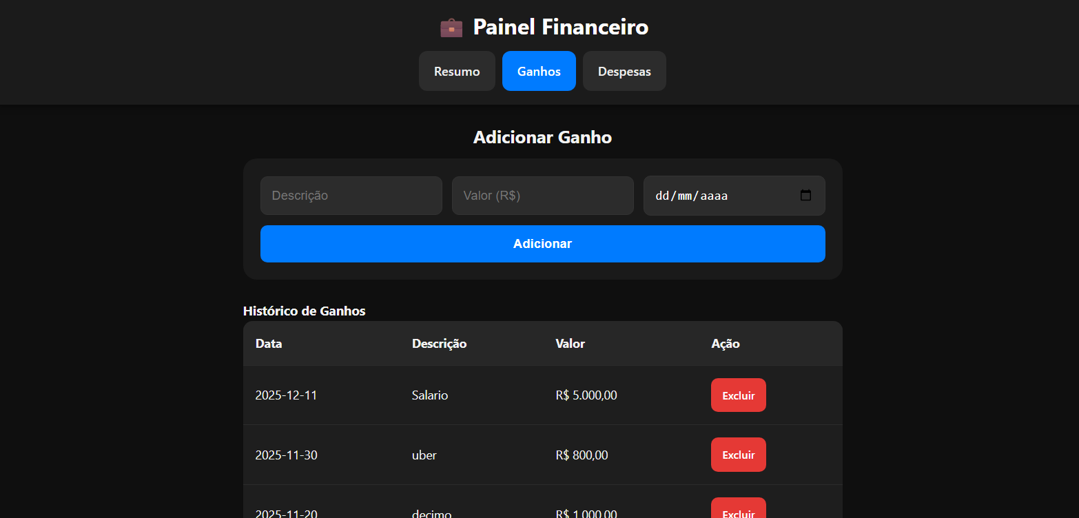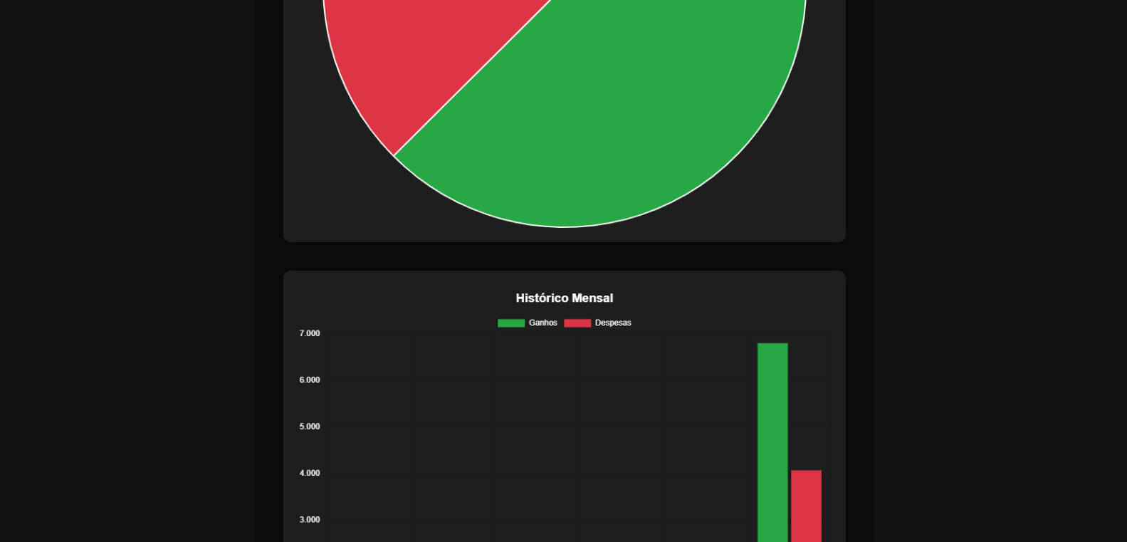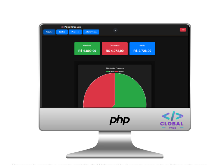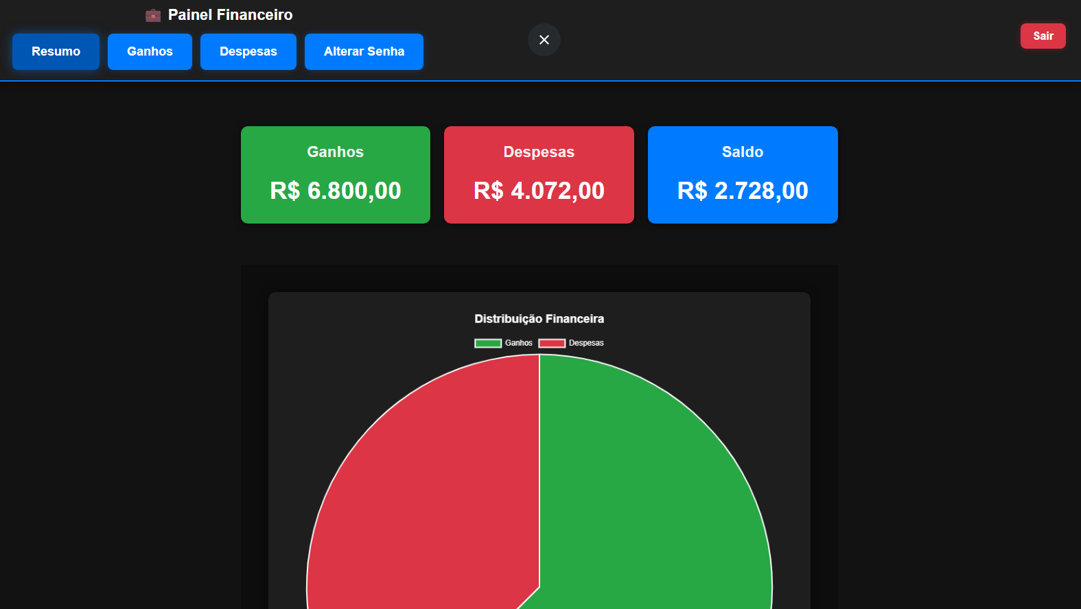 O sistema soma seus ganhos, desconta as despesas e exibe o saldo atualizado em tempo real, mostrando lucro ou prejuízo instantaneamente.